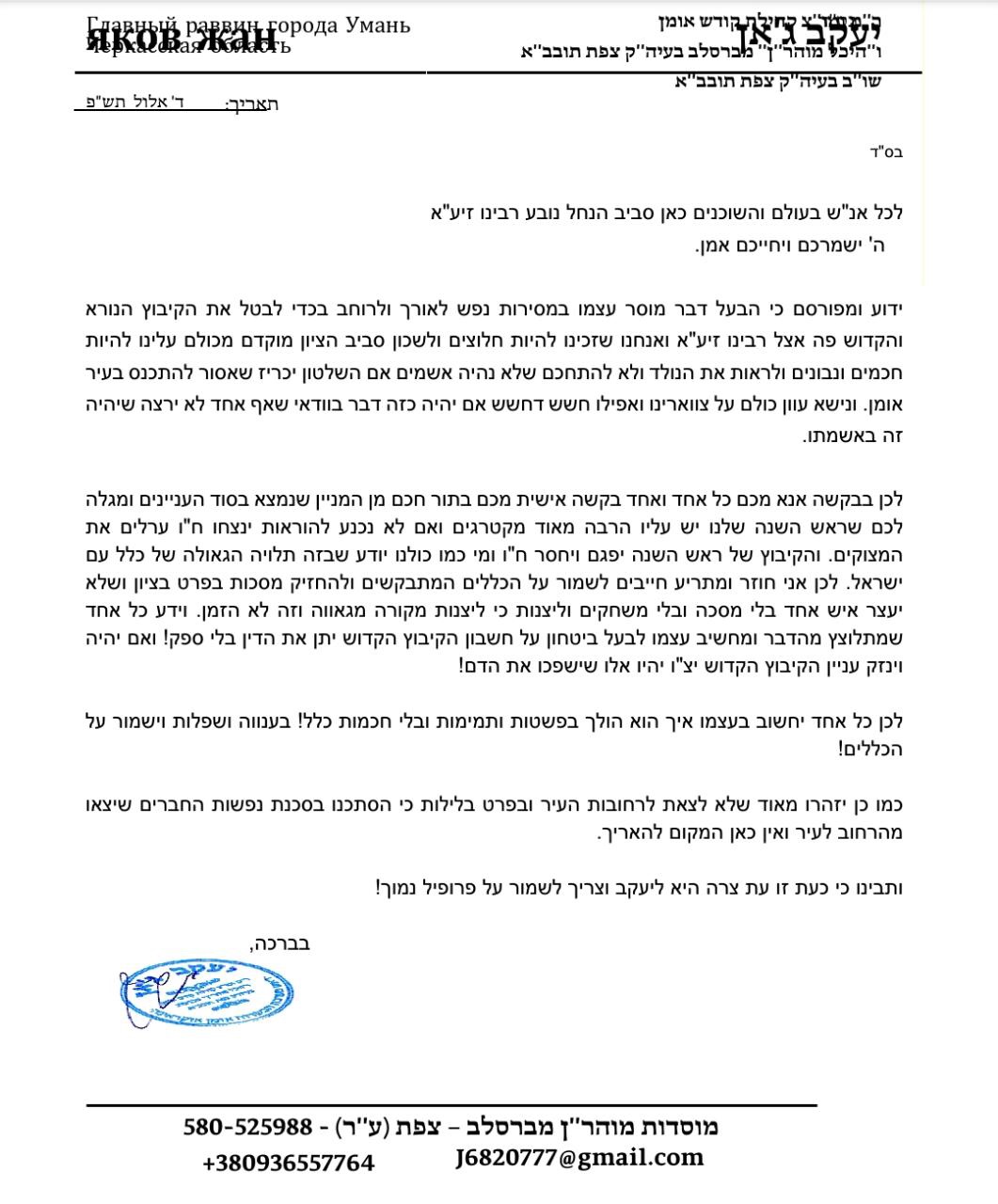כידוע קיימת בשבועות האחרונים סערה סביב הטיסות לאומן לקראת ימי הקיבוץ באש השנה תשפ״א, הרב ג׳אן במכתב חריף